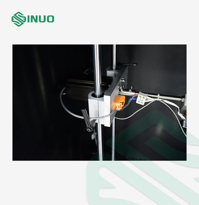 Füllen Sie 10 ml brennbare Flüssigkeit mit der angegebenen Leistung (durchschnittlicher Heizwert 38 MJ/L, Masse pro Volumeneinheit zwischen: 0,845 g/ml~0,865 g/ml, Flammpunkt: 43,5℃~93,5℃) in die Metallpfanne, nach dem Erhitzen auf den Zündpunkt des Destillationsbrennstoffs und dem Verbrennen von 1 Minute treibt der Motor den Löffel in einer bestimmten Höhe (100 mm) und mit einer bestimmten Durchflussrate (1 ml/s) an und gießt dann die brennbare Flüssigkeit gleichmäßig auf die Mitte der Öffnung der Probe (Brandschutzgehäuse). Die Brandschutzleistung des Testprodukts wird anhand der Frage bewertet, ob die Zündunterlage in der angegebenen Entfernung (50 mm) und mit der angegebenen Dichte (40 g/m2) unter dem Testprodukt entzündet wird.